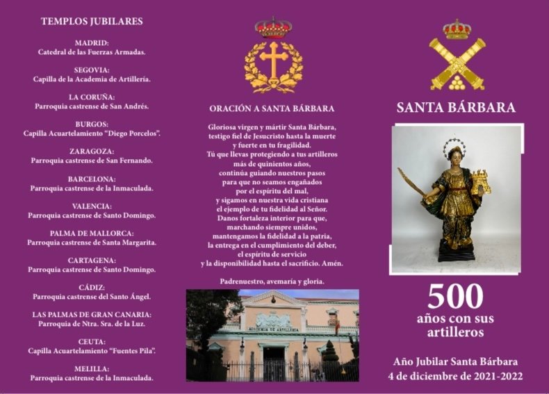 El Arzobispado Castrense con motivo del quinto centenario de la proclamación de Santa Bárbara como Patrona de Artillería ha creado una condecoración denominada “MEDALLA CONMEMORATIVA DEL QUINTO CENTENARIO DE LA PROCLAMACIÓN DE SANTA BÁRBARA COMO PATRONA DE LA ARTILLERÍA ESPAÑOLA” con el fin de darle máxima relevancia al hecho del patrocinio de Santa Bárbara durante todos estos 500 años y reconocer públicamente su celebración.